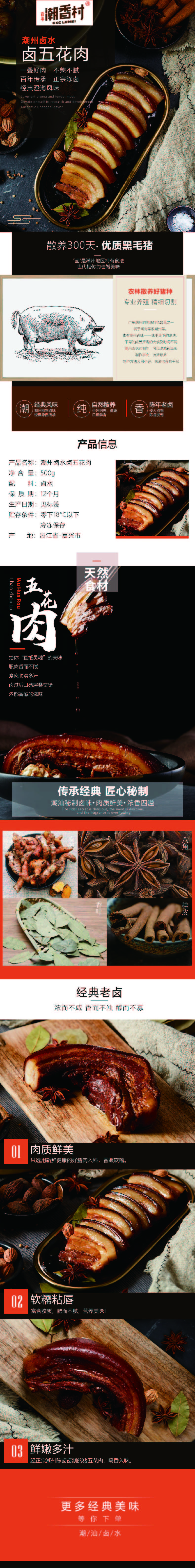 產品介紹:潮州鹵五花肉——優選自然散養黑毛豬肉,給你“直抵靈魂”的美味,肥肉香而不膩 瘦肉順滑多汁,鹵過后口感層疊交錯 濃郁香醇的滋味。 工藝:陳鹵鹵制 規格(g):500g 包裝規格:500g/袋 箱規:無