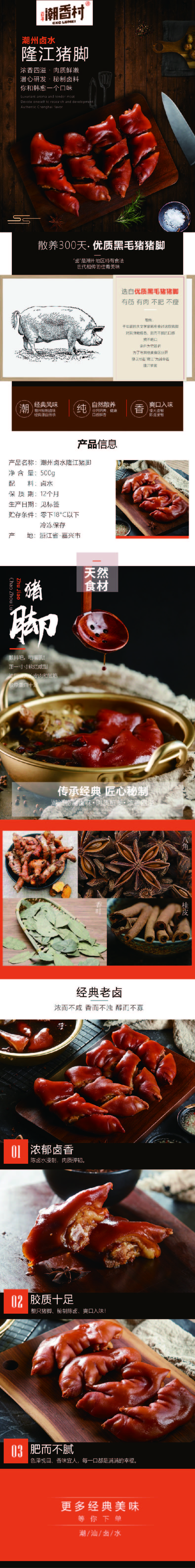 產品介紹:潮州鹵水 隆江豬腳——韓愈的最愛!相傳,千年前的大文學家韓愈食過這款豬腳,對其彈嫩糯香、肥而不膩的口感贊不絕口,親自為它題名,為了與其他美食區分開,便以地名“隆江”為其命名--隆江豬腳。從此,隆江豬腳名揚四海,備受廣東人民歡迎,當地流傳著這樣一句話:“吃隆江豬腳要用鐵絲箍住舌頭,不然會把舌頭和豬腳一起吞下。”